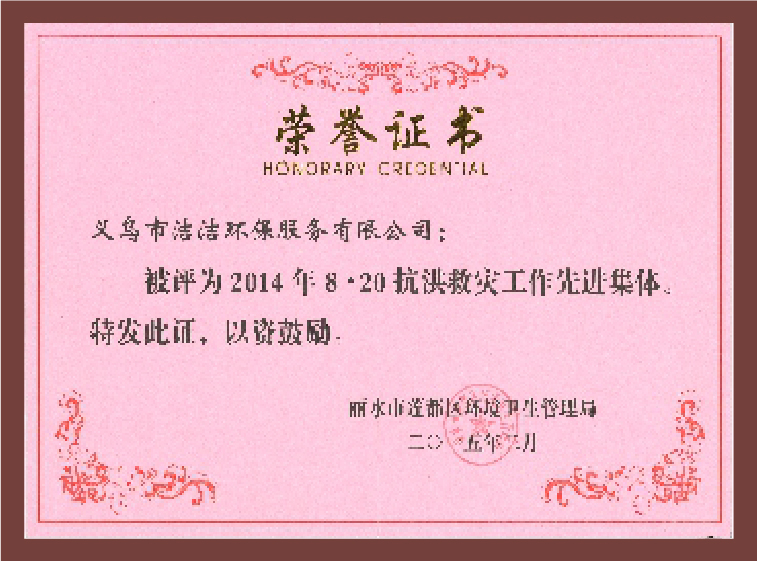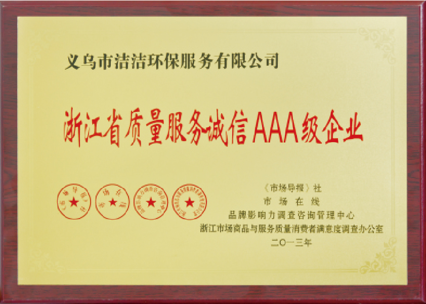 重要榮譽:“全國信用等級AAA級企業”、全國“重質量、守信 用企業”、“浙江省質量服務誠信AAA級企業”、中國中小商業 企業協會清潔行業分會常務理事員會單位